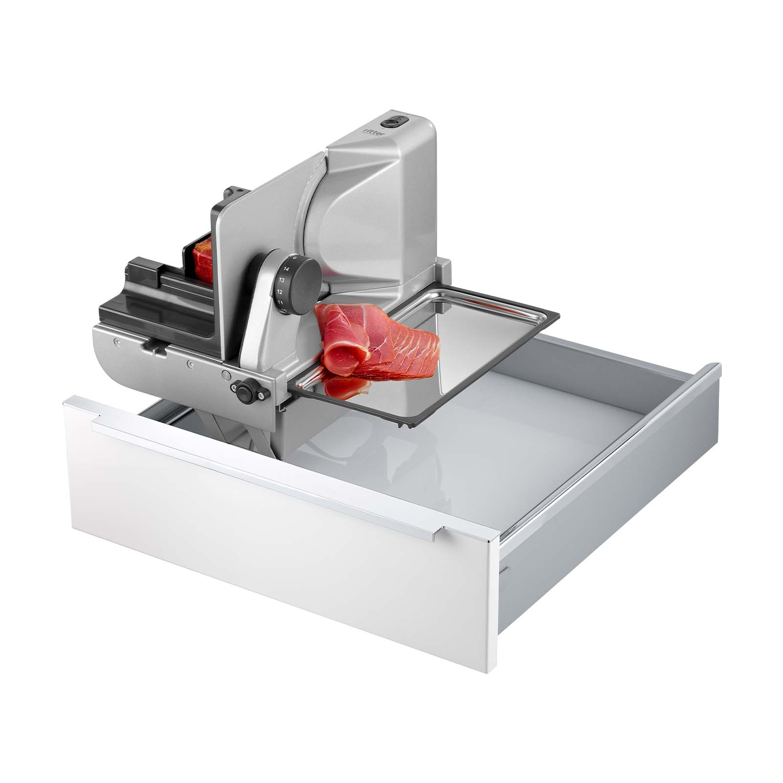 The BFS 62 SL-H built-in food slicer is the perfect solution for anyone looking for functionality and space saving in their kitchen. This innovative food slicer is specially designed for installation in standard drawers with a cabinet width of 50 cm or more and requires a clear width of more than 392 mm. With a minimum clearance of 165 mm and a maximum clearance of 210 mm between the drawer base and the top edge of the worktop, the BFS 62 SL-H fits perfectly into modern kitchen concepts, especially in handleless kitchens or with extra-thick worktops.