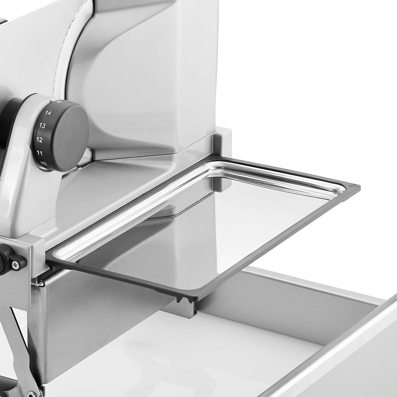 The food tray to catch the sliced food is placed underneath the circular blade so that the slices can fall directly onto it. The sliced product can be conveniently and directly served using the practical food tray made of high-quality, easy-to-clean plastic.