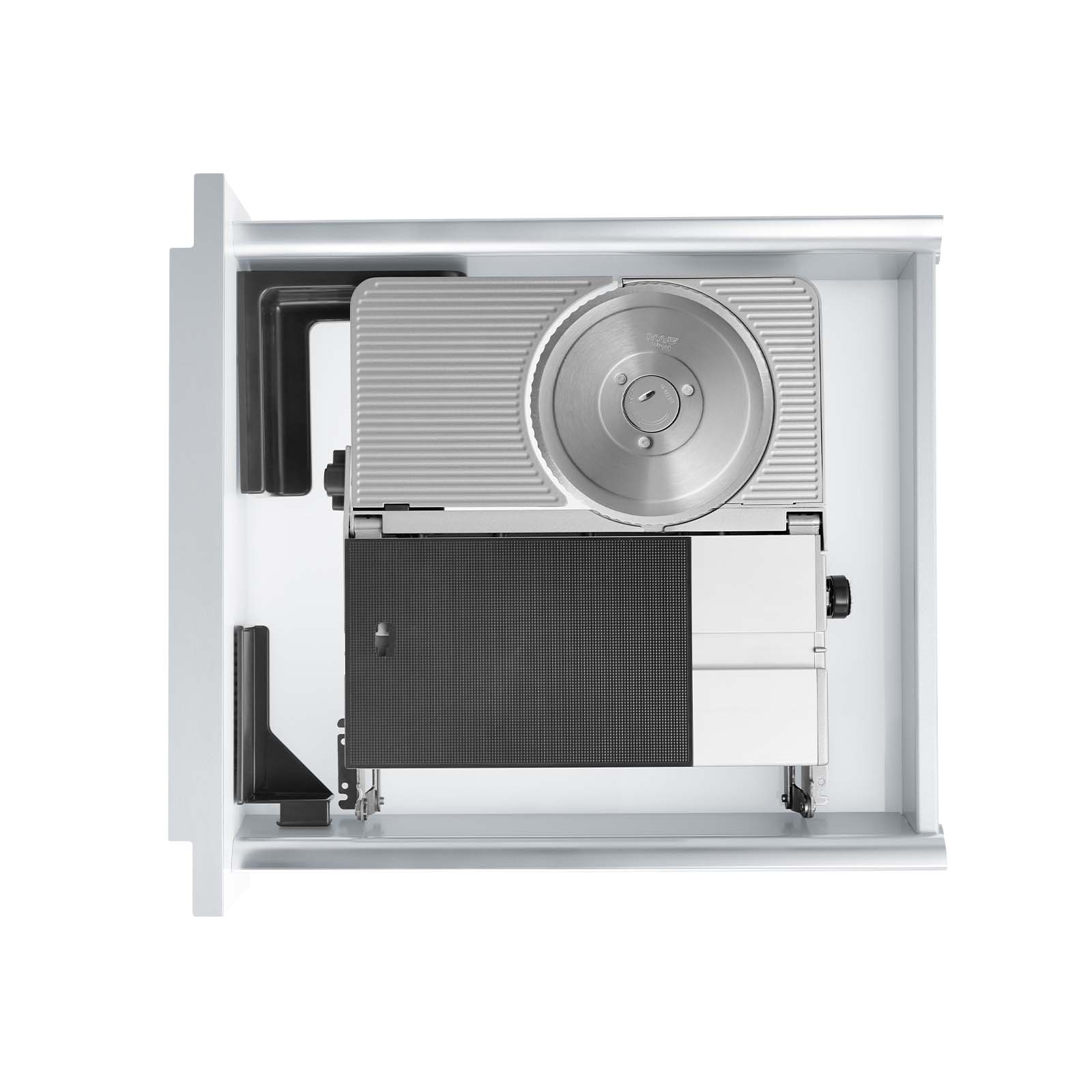 Discover the BFS 62 SR built-in food slicer - the ideal solution for anyone who wants to save space in their kitchen without compromising on functionality. This innovative food slicer is specially designed for installation in drawers from a cabinet width of 45 cm and impresses with its right-hand slicing guide. The BFS 62 SR can be opened effortlessly with just one hand movement and is ready for use in no time at all, making it the perfect addition to any modern kitchen.