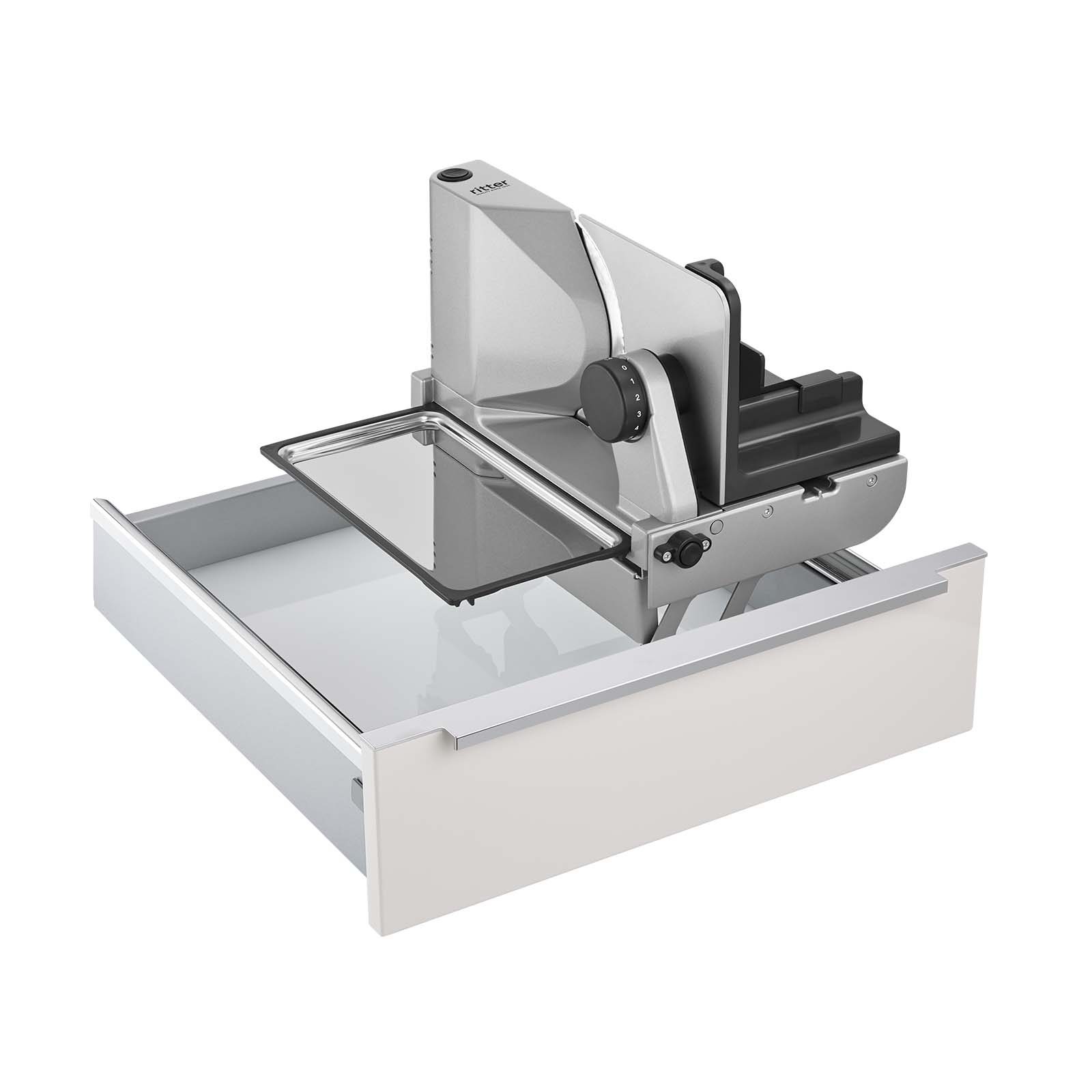Food slicers built into kitchen drawers are space-saving and yet always within reach. The built-in solution also frees up space on the countertop.