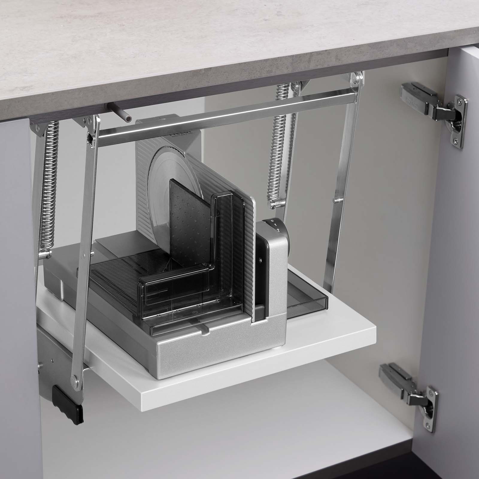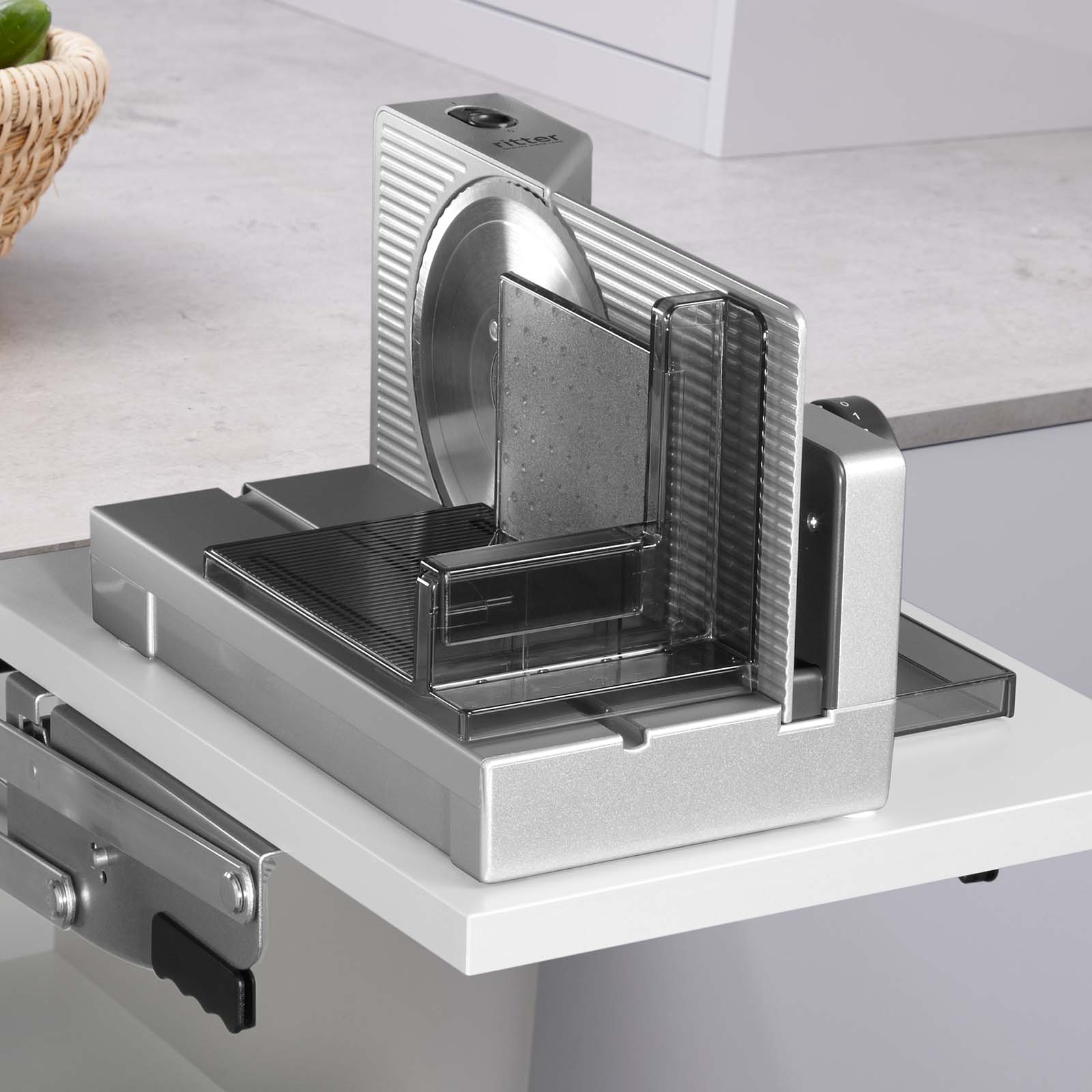 The E 118 is mounted on a swivel mechanism that allows the appliance to be simply pulled upwards when required. This means that the slicer is immediately ready to hand and in operation, while it can be stowed away in the base cabinet after use to save space. *Please note that the swivel mechanism is not included in the scope of delivery.