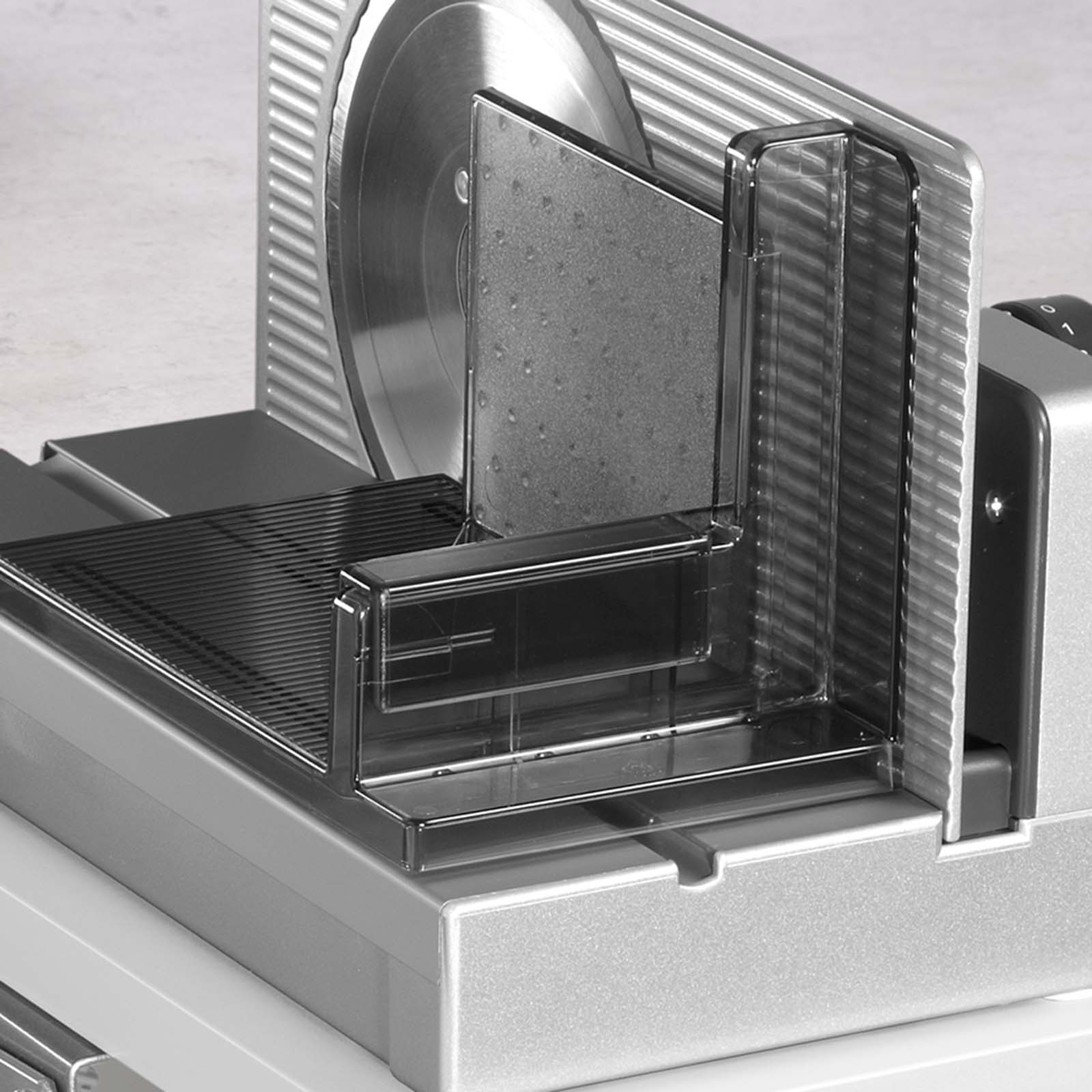 The food tray is placed under the circular blade to collect the slices. It is also suitable for serving and is made of high-quality, lightweight plastic.