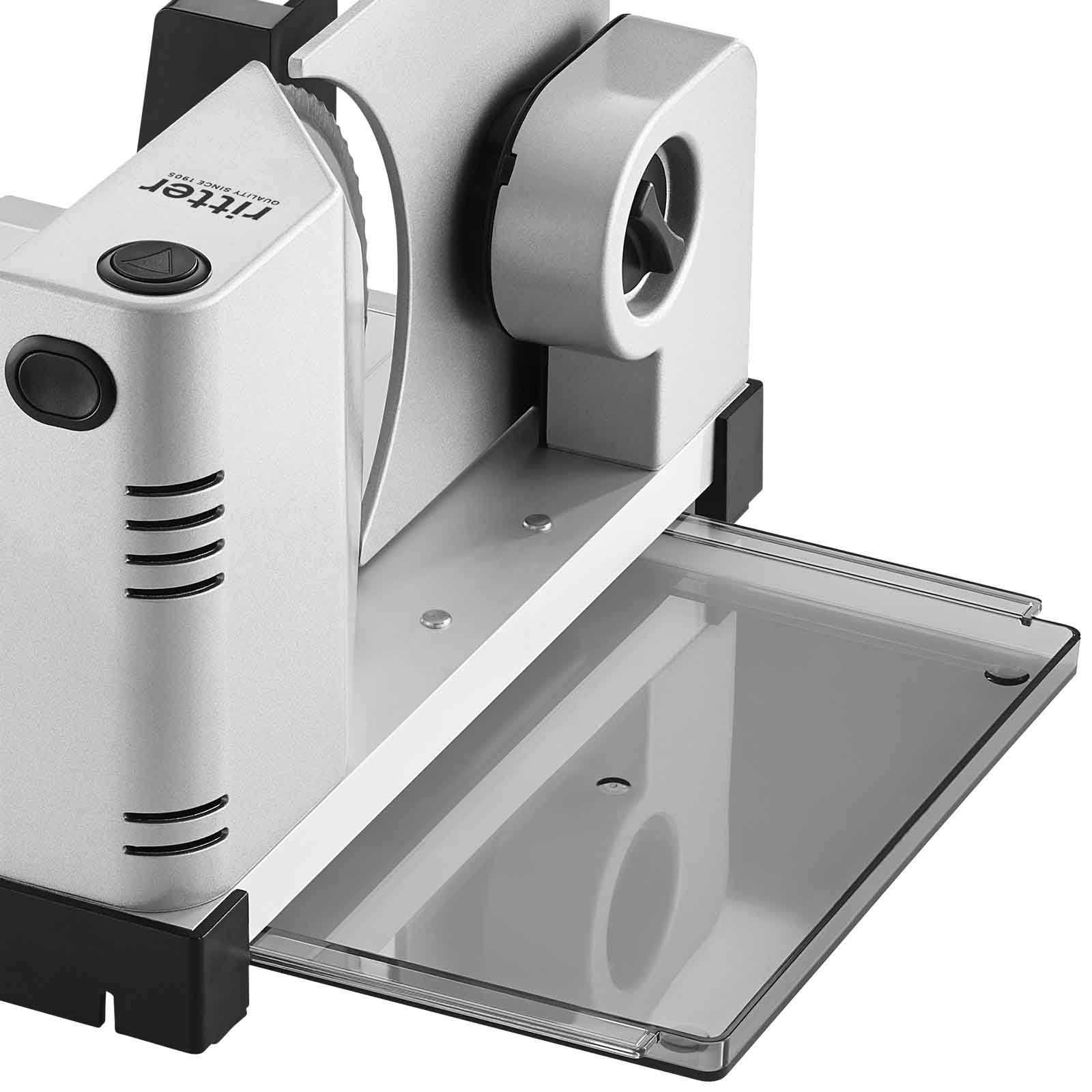 - Dieses Gerät darf nicht ohne Schneidgutschlitten oder Restehalter benutzt werden, es sei denn die Größe und Form des Schneidguts lässt deren Gebrauch nicht zu.