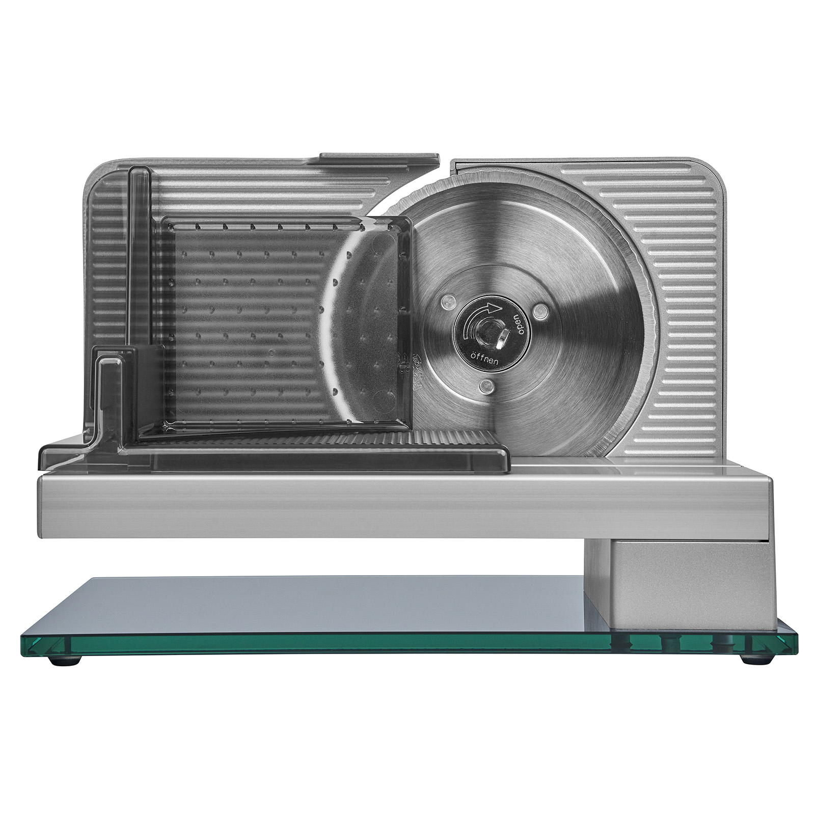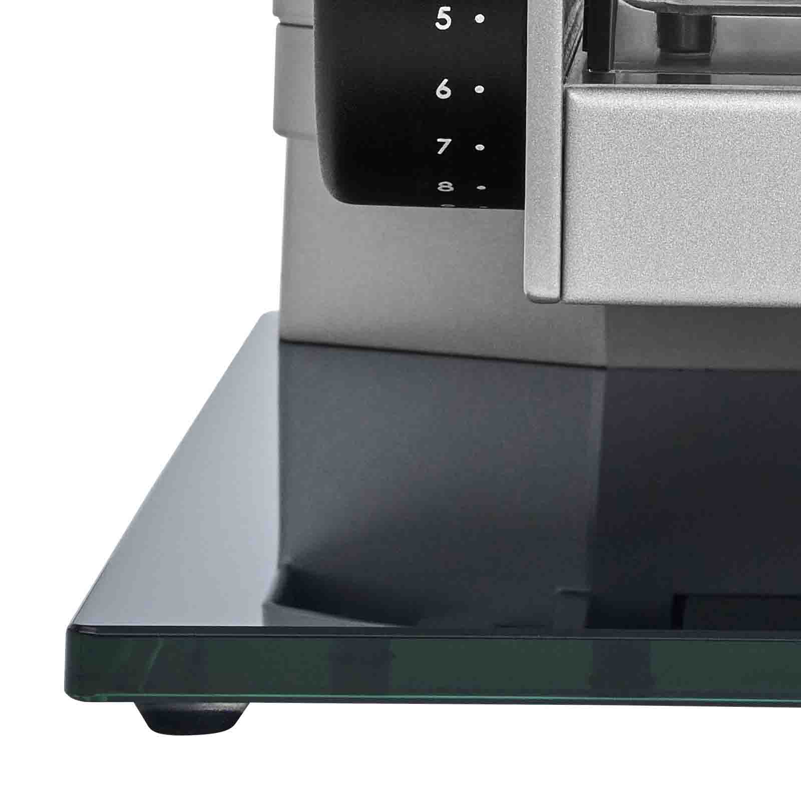Die freitragende Metallkonstruktion mit stilvoller Bodenplatte aus Glas erlaubt das direkte Ablegen der appetitlich geschnittenen Scheiben auf Teller und Platten. Die Bodenplatte des Allesschneiders besteht aus einem hochwertigen, bruchsicheren Glas und verleiht dem Gerät eine exklusive Anmutung.