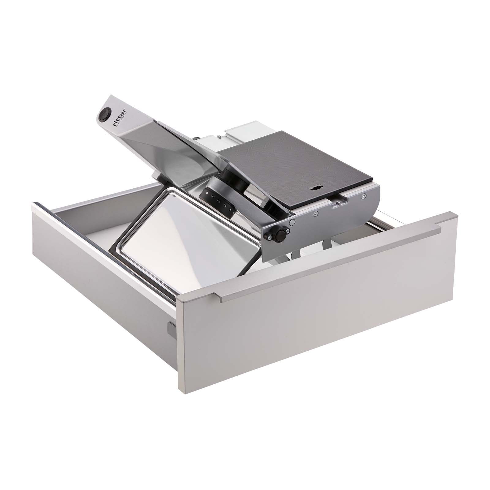 In Küchenschubladen eingebaute Allesschneider sind platzsparend und dabei doch immer griffbereit. Die Einbaulösung schafft zudem noch Platz auf der Arbeitsplatte.