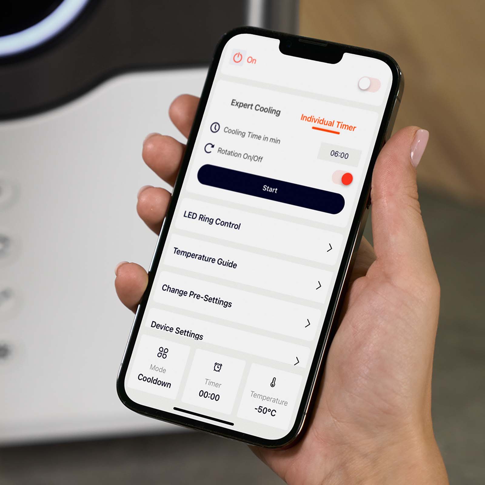 - Der BEEZER® darf nur zum Vorkühlen des Geräts, nicht zum eigentlichen Kühlen von Getränken, von unterwegs aus über die App aktiviert werden.