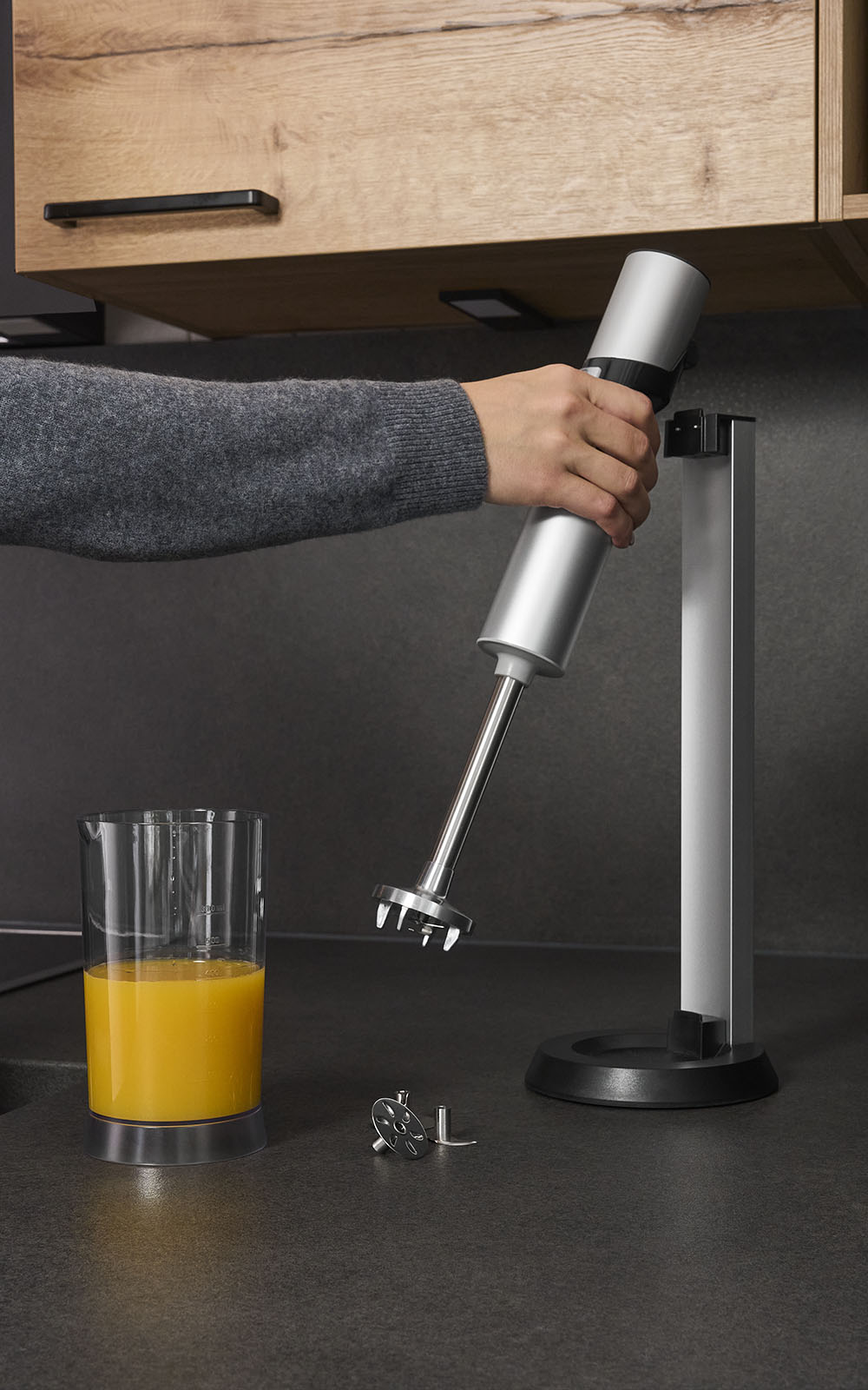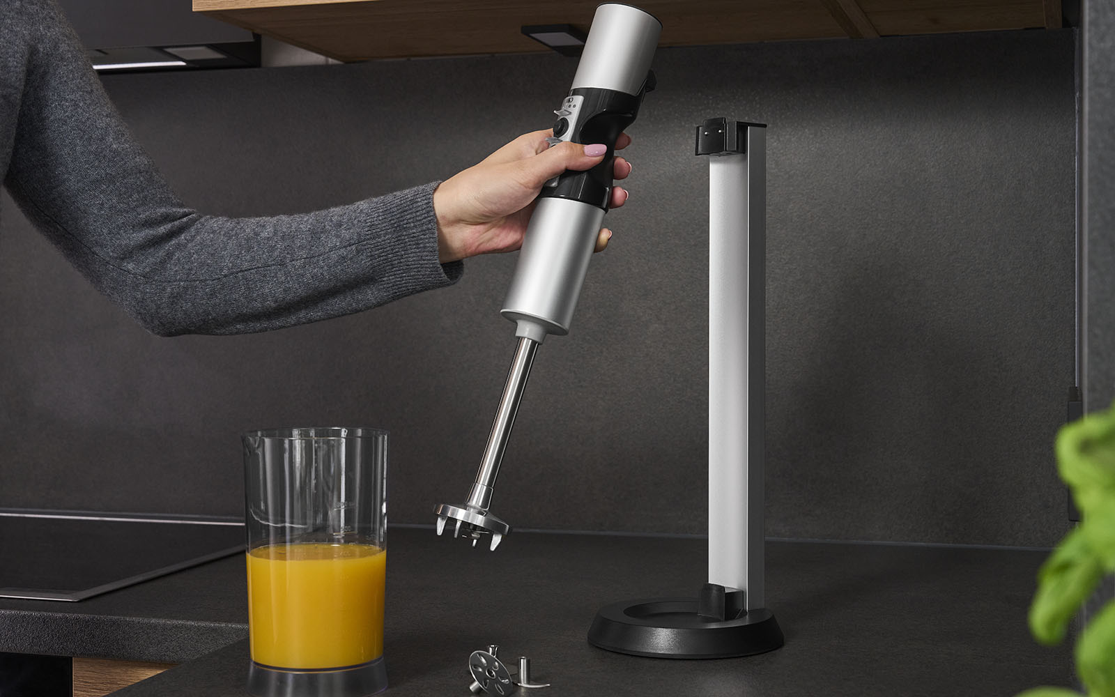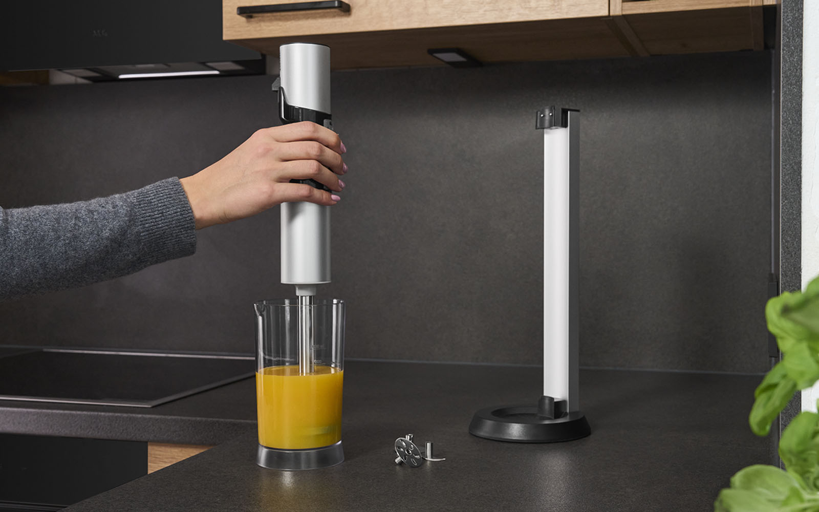 Aufbewahrt wird der Stabmixer in der Ladestation – so ist er stets griffbereit und lädt nach jedem Gebrauch automatisch wieder auf, sobald man ihn dort einhängt.