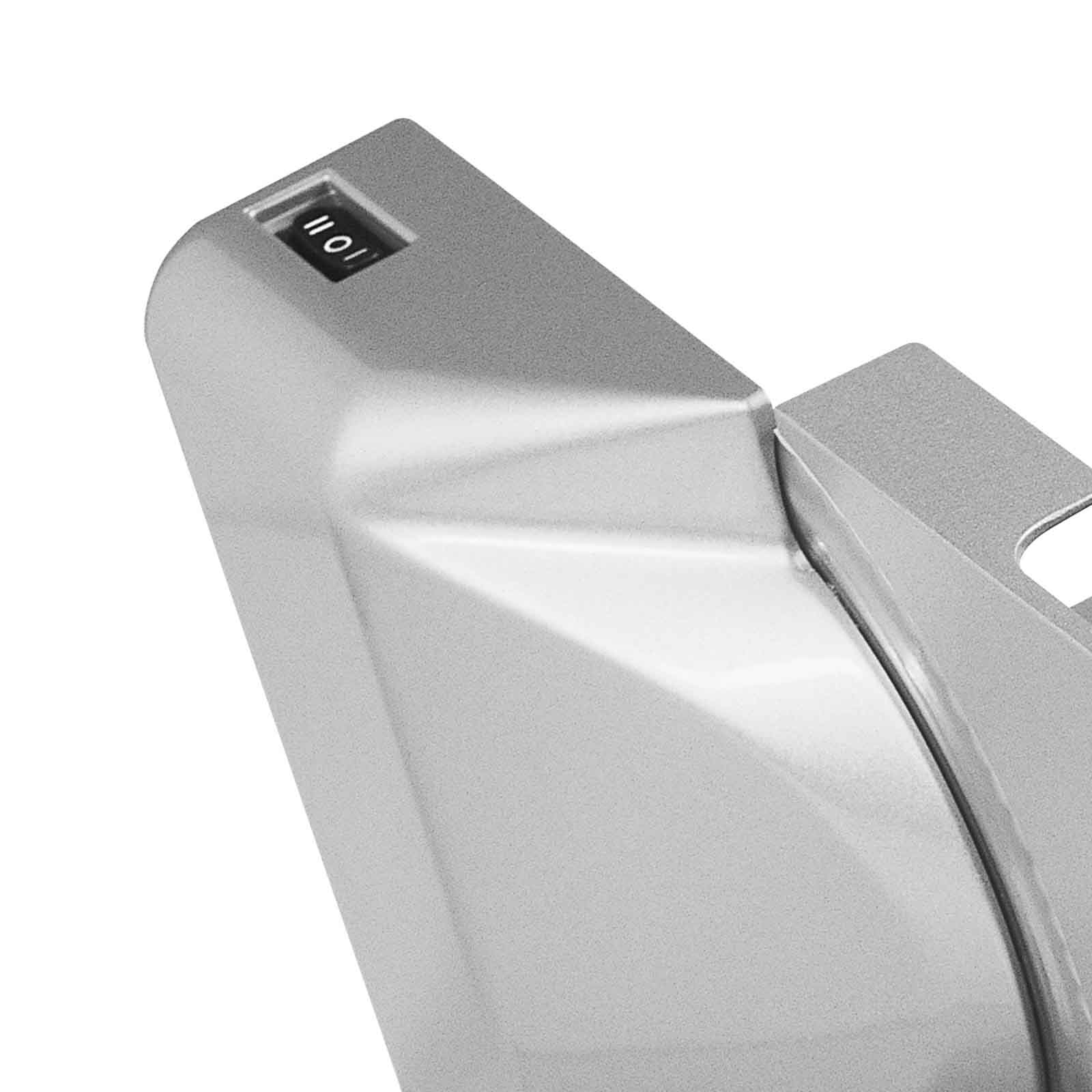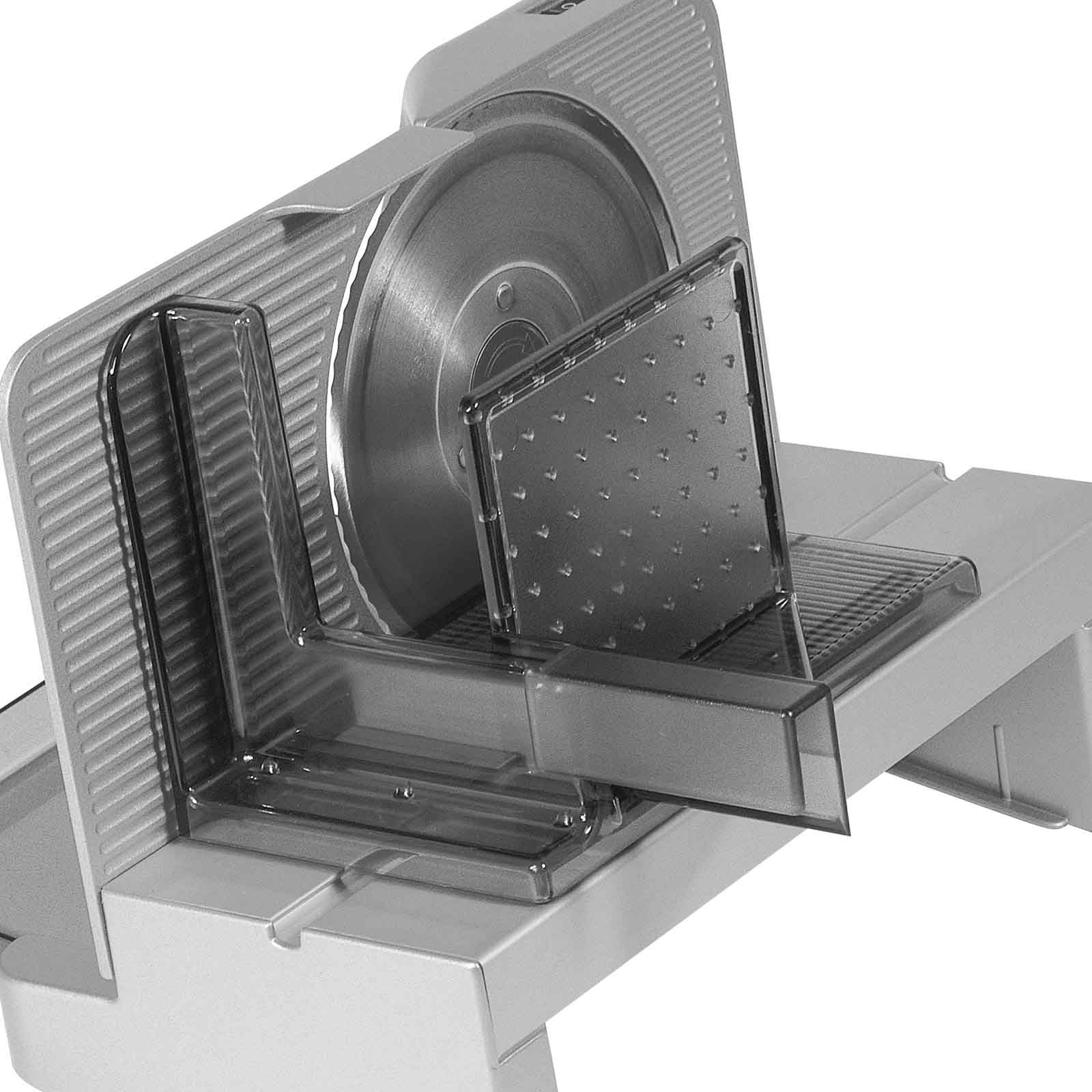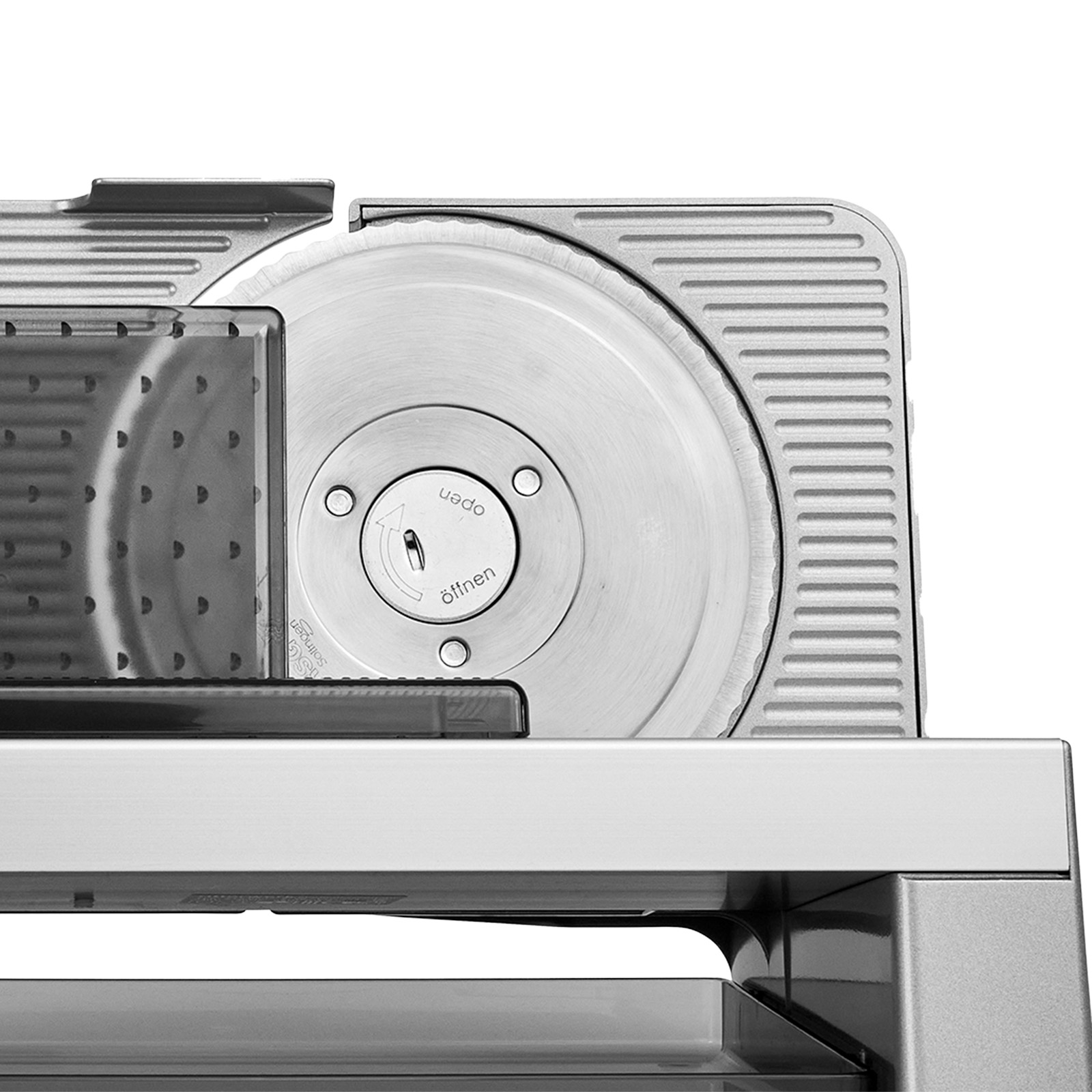 The food slicer impresses with its sturdy metal construction and compact handling. It is ideal for a variety of foods, including bread, fruit, vegetables and cheese. Thanks to the robust metal parts, it guarantees precise results.