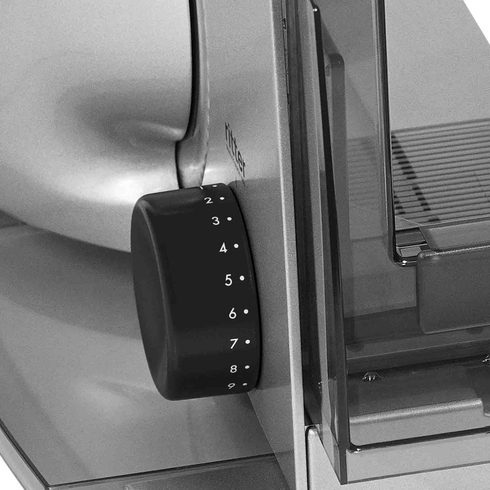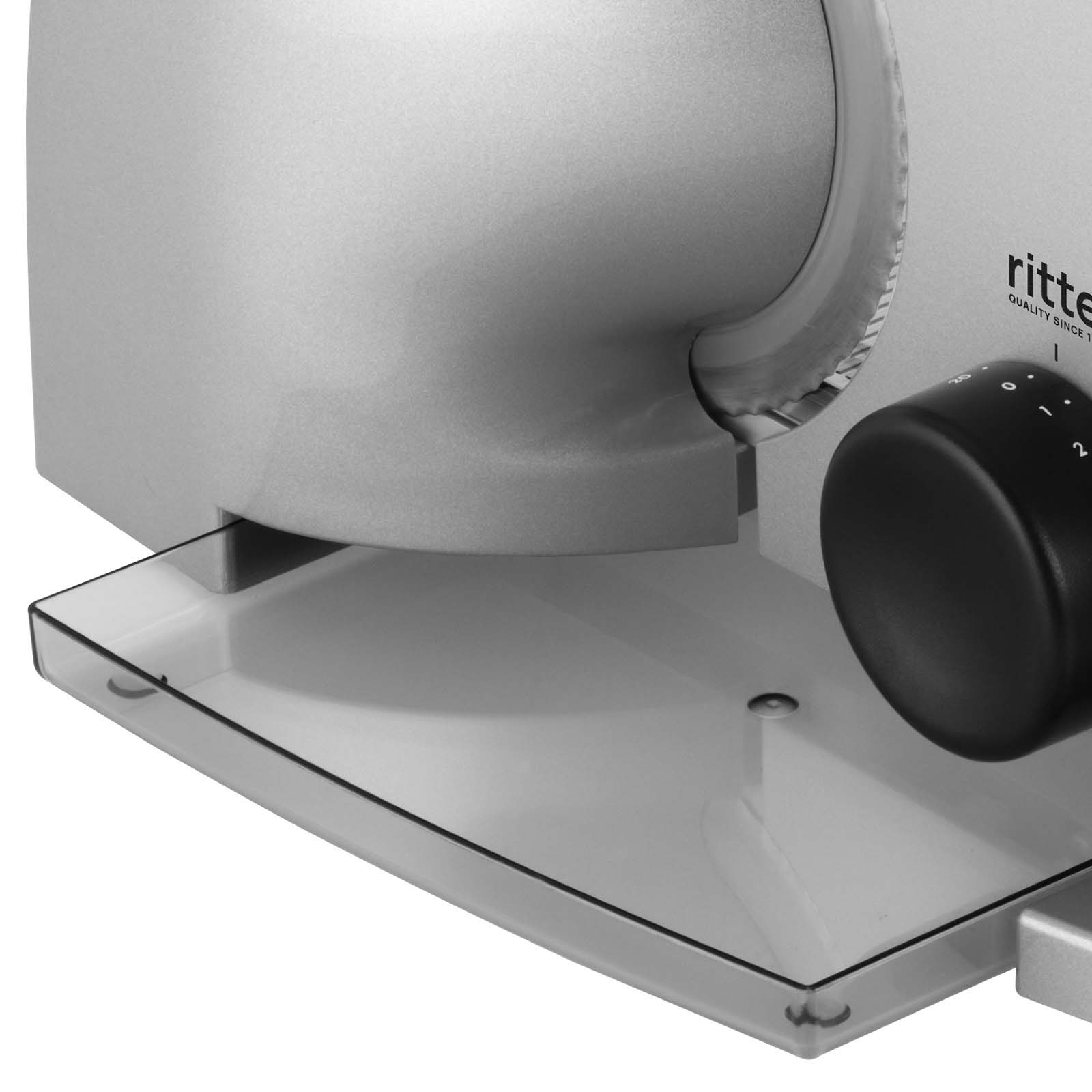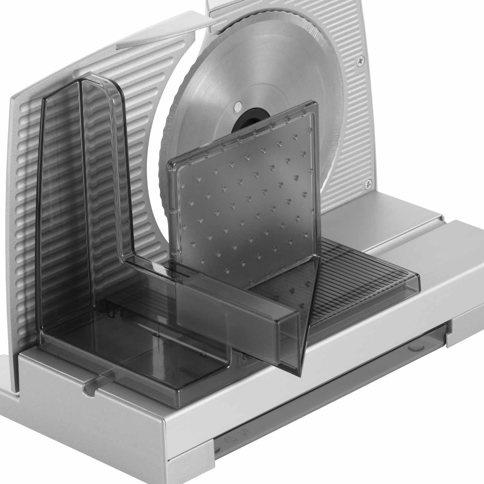The slice thickness can be adjusted continuously up to approx. 20 mm. The detachable carriage allows to also cut off larger pieces of food. A food tray and cable compartment are included.